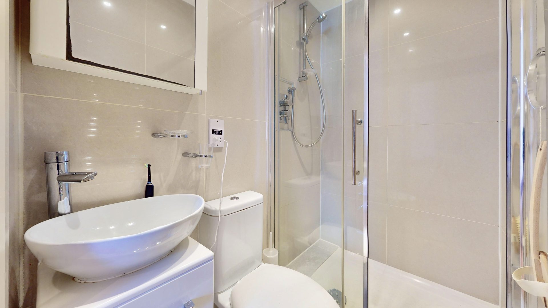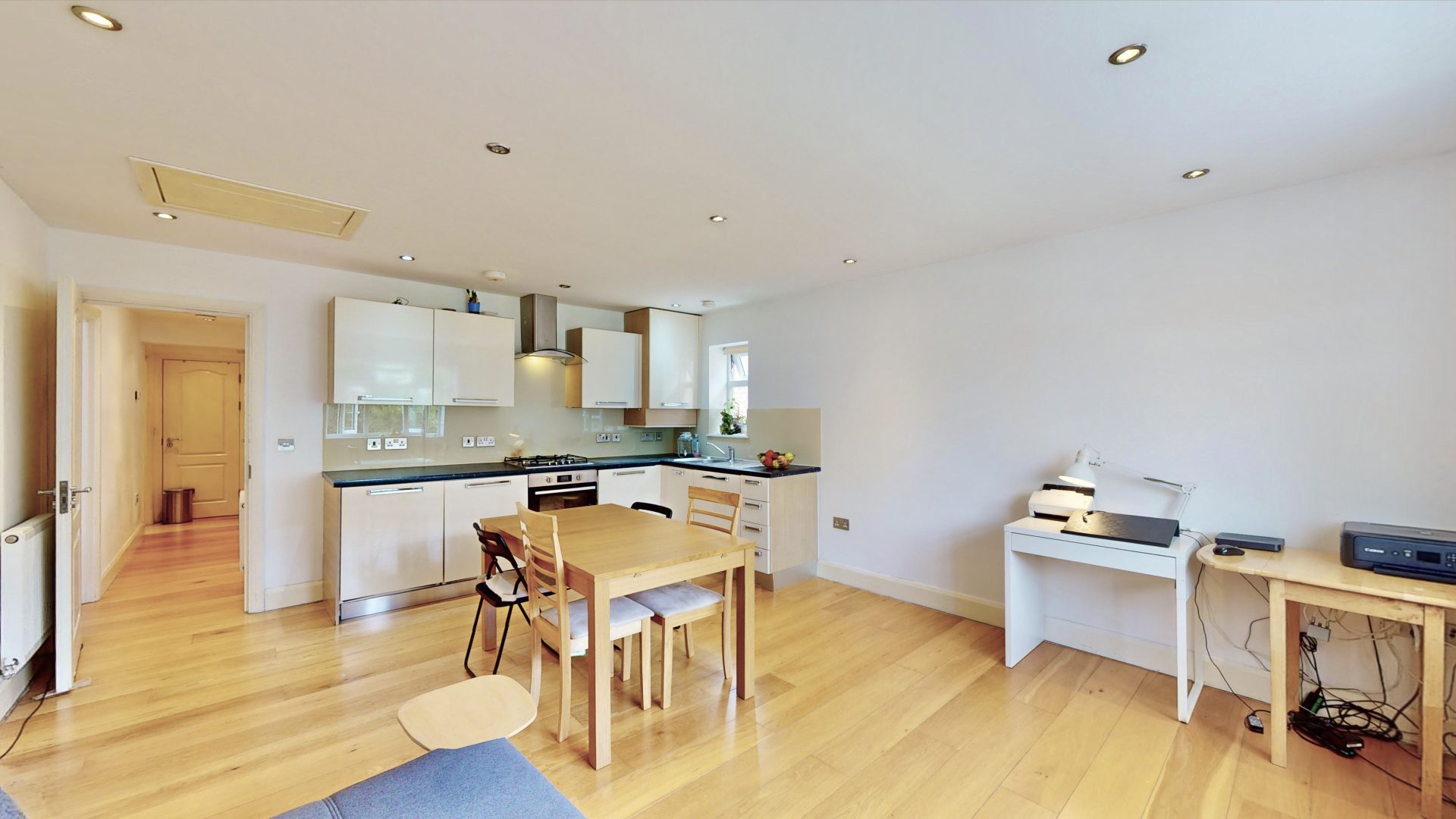 The flat comprises an open-plan kitchen/living room, two bedrooms, and two bathrooms, including an en-suite. It also benefits from a patio and direct access to a communal garden for residents’ use.